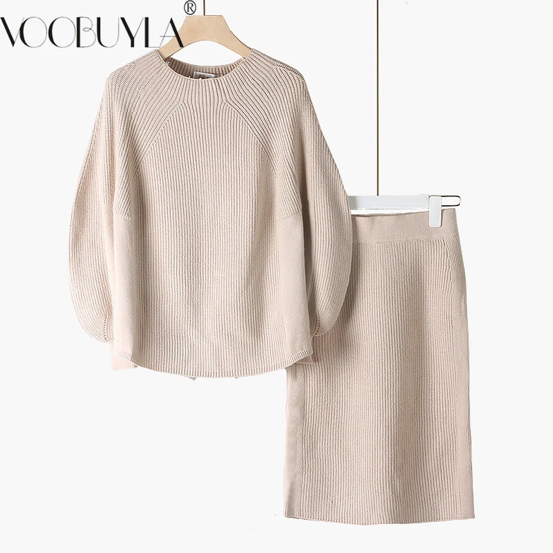 Trui En Rokken Gebreide Suit Vrouwen Oversize Effen Kleur Twee Feminino