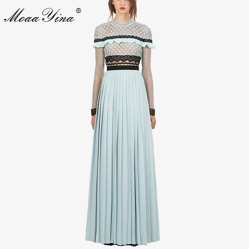 Kopen Goedkoop MoaaYina Fashion Designer Landingsbaan Jurk Herfst Vrouwen Lange mouwen Lace Hollow Out Ruches Spliced Casual Party Elegante Slanke Jurk Prijs