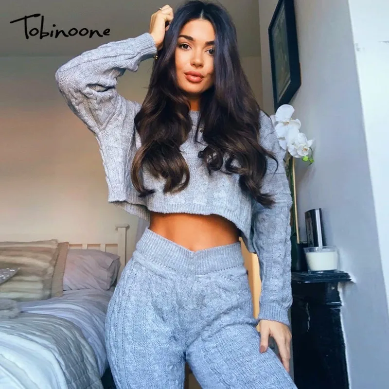 Beste Koop Tobinoone Womens Tweedelige Sets 2018 Herfst Broek Set Casual Grijs Winter Lange Mouw 2 stuk Set Vrouwen Gebreide Trui outfits Goedkoop
