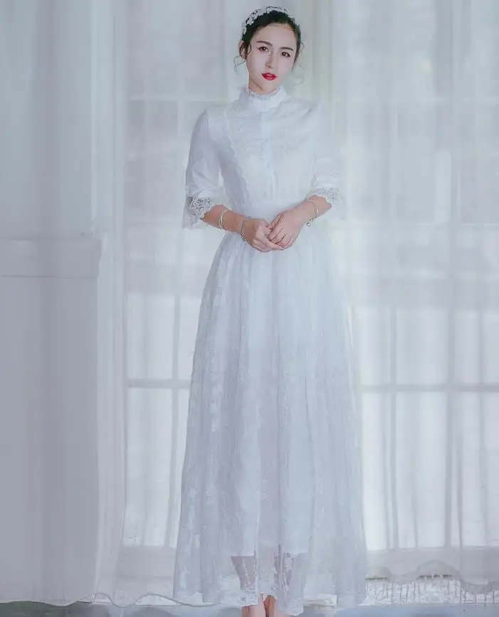 Goede Koop Nieuwe Vintage Vrouwen Dress Three Kwart Mouw Lace Fairy Elegante Jurken Wit 8021 Goedkoop
